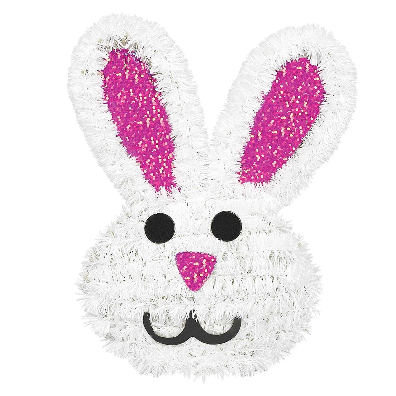 This product comes with 1 Tinsel Bunny 3D Decorations Bring a cute bunny to your celebration with our Tinsel Bunny 3D Decorations This Tinsel Easter Bunny decoration features a cute bunny head design attached to a plastic frame with a triangular pink nose and ears With white tinsel glittery pink ears and nose this bunny decoration adds festive charm to your Easter decoration This product is made of tinsel and wire that measures 12cm x 15cm tall A cute decoration best used for Easter or Holiday themed partiesSafety WarningNo warning applicableBox Contains1