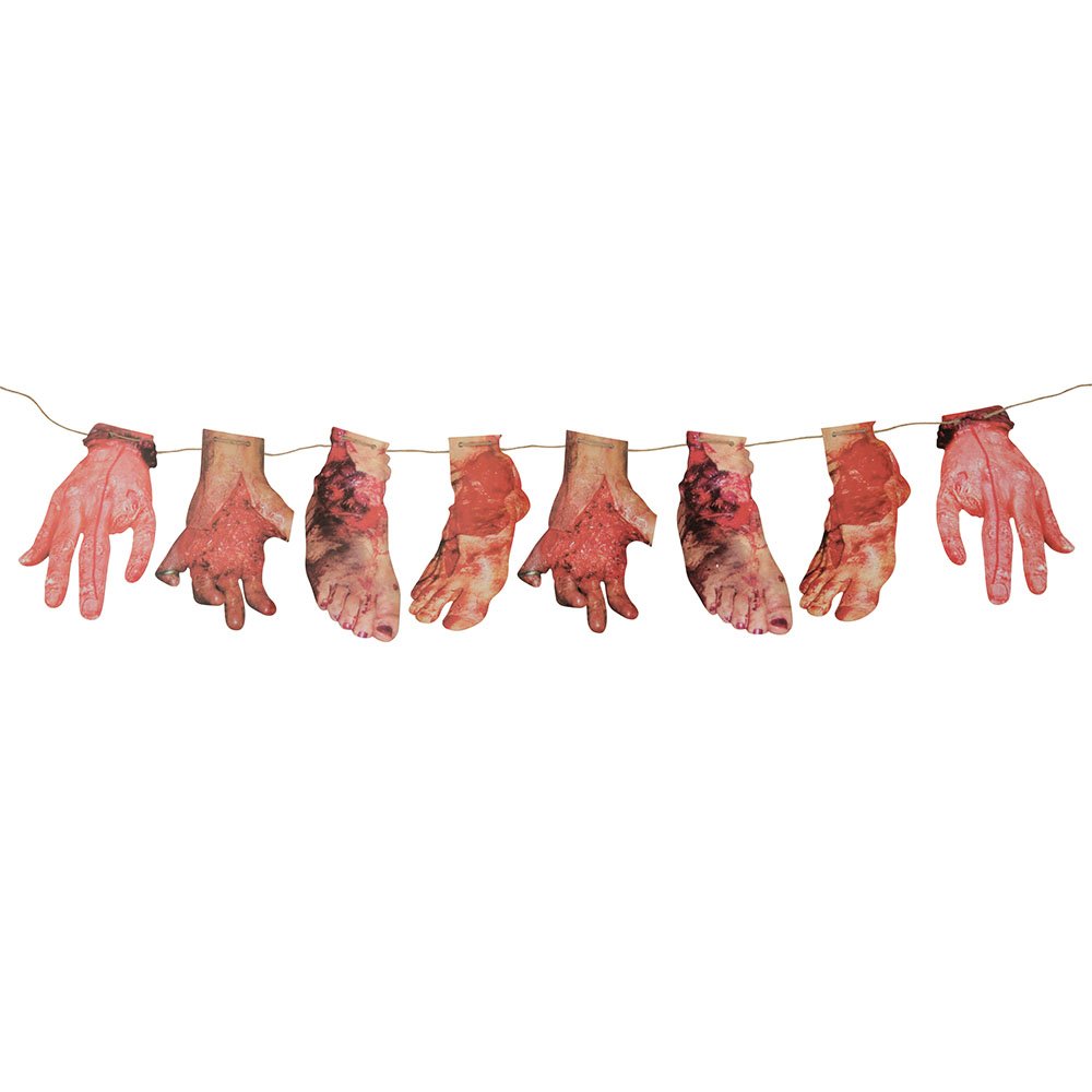 This brilliant bloody hand and foot banner is the perfect accessory for your Halloween party or themed event. This bloody hand and foot banner is the perfect addition to any Halloween party or haunted house! Safety Warning Warning! Keep away from fire. Box Contains 1 x Bloody Hand/Foot Banner
