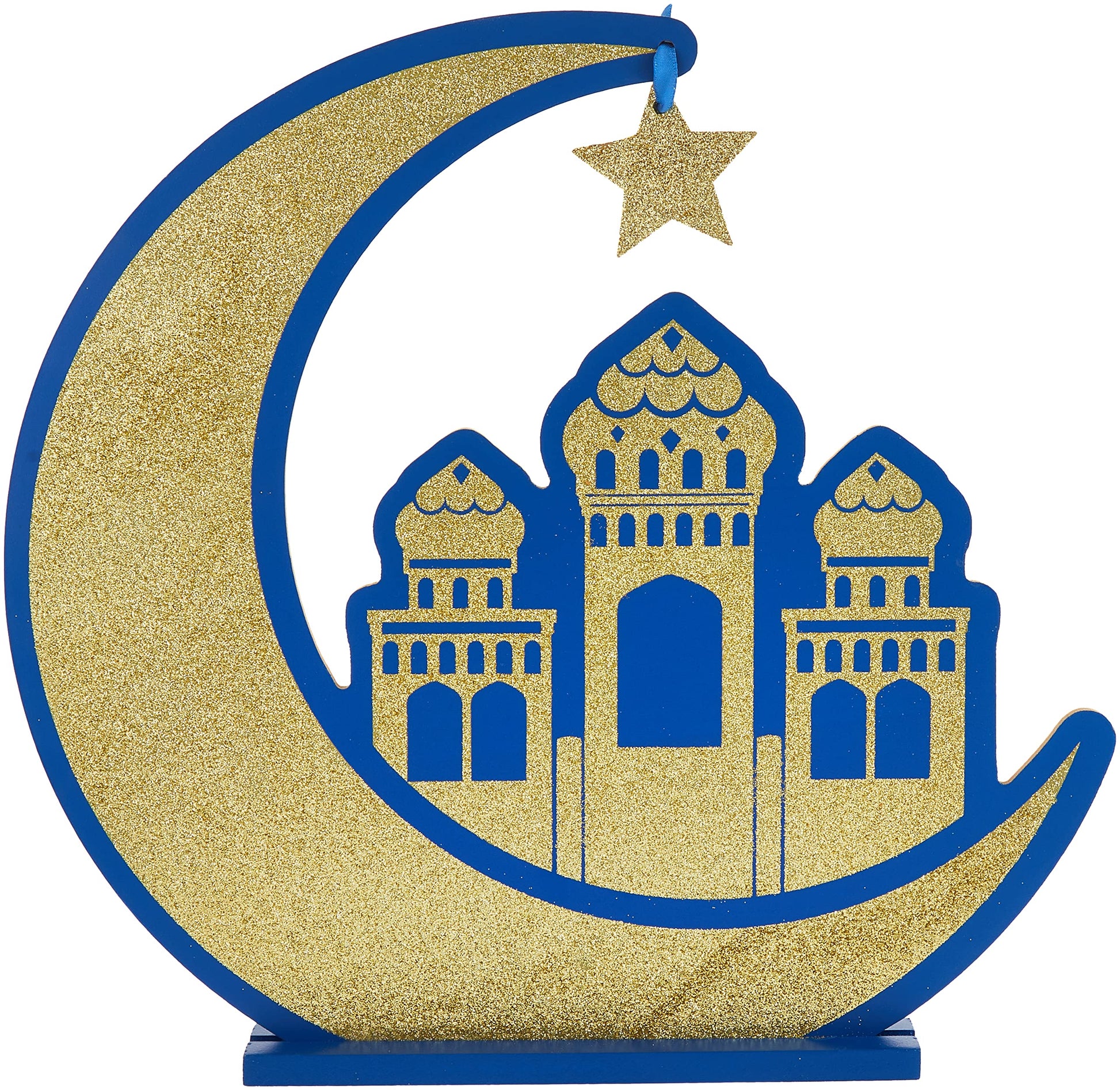 Add some shine to your table with this Glitter Eid Table Sign! This fiberboard sign is shaped like a crescent moon with a dangling star and a mosque The front of this decoration is painted blue and features gold glitter that shimmers in the light Set this religious decoration on your table during an Eid al-Fitr or Eid al-Adha feast!Safety WarningNo warning applicable