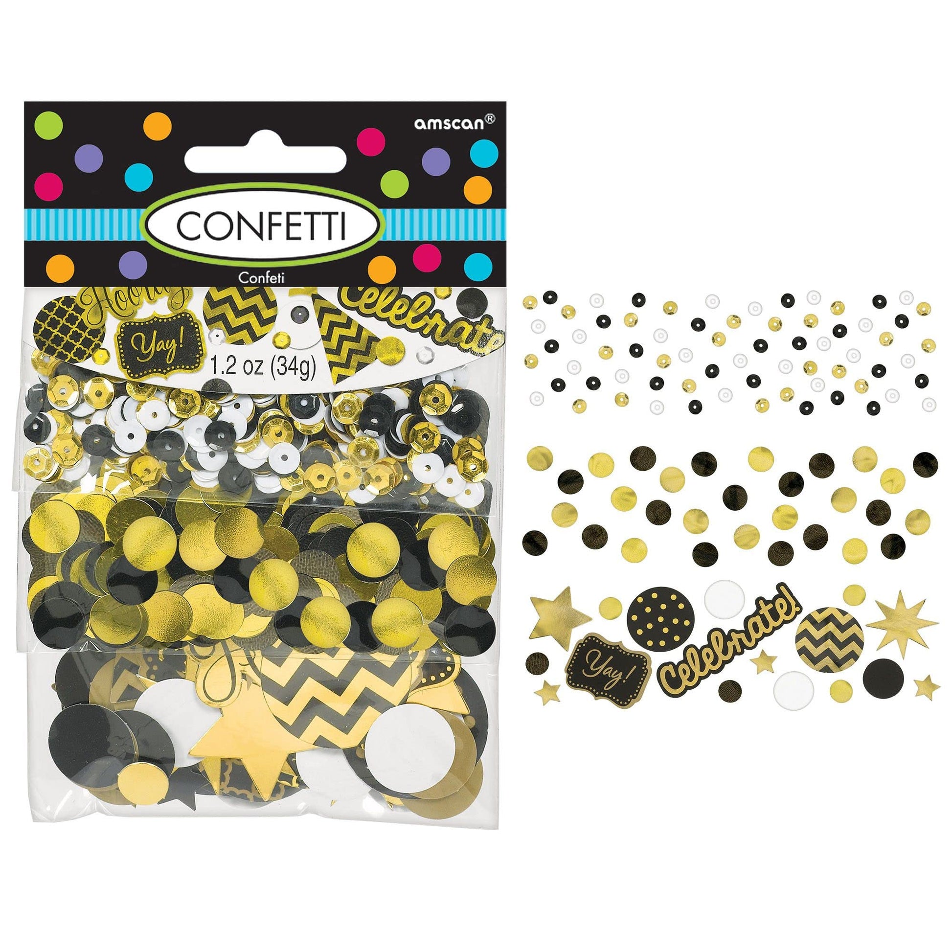 Add sparkle to your party decoration with this gold foil and paper confetti Featuring gold and black foil paper and sequin in assorted designs Safety WarningNo warning applicable Box ContainsAmscan International 360219 Confetti