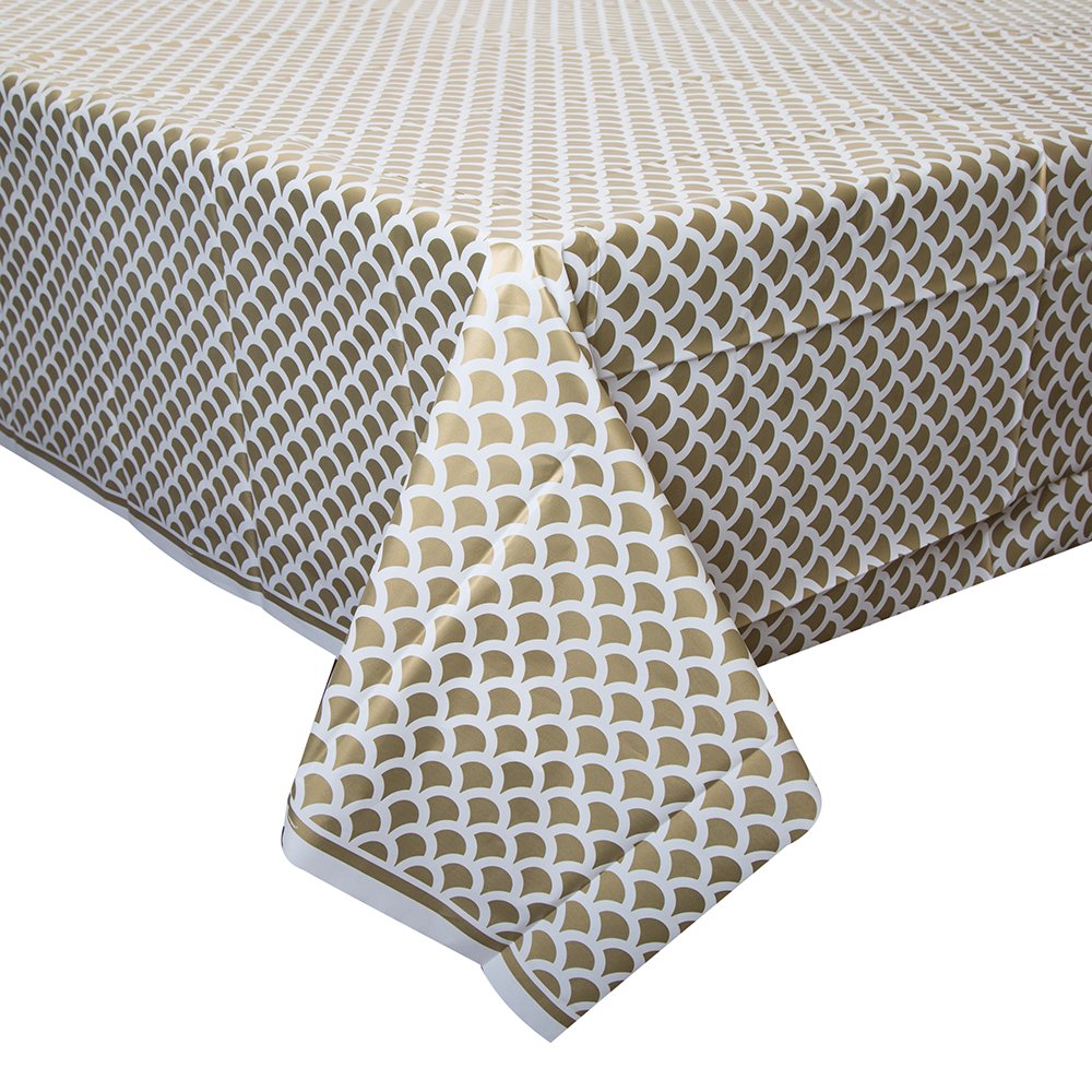 Unique Party 37233-Gold & White Scallop Print Plastic Tablecloth, 9ft x 4.5ft, Gold, 108" x 54"